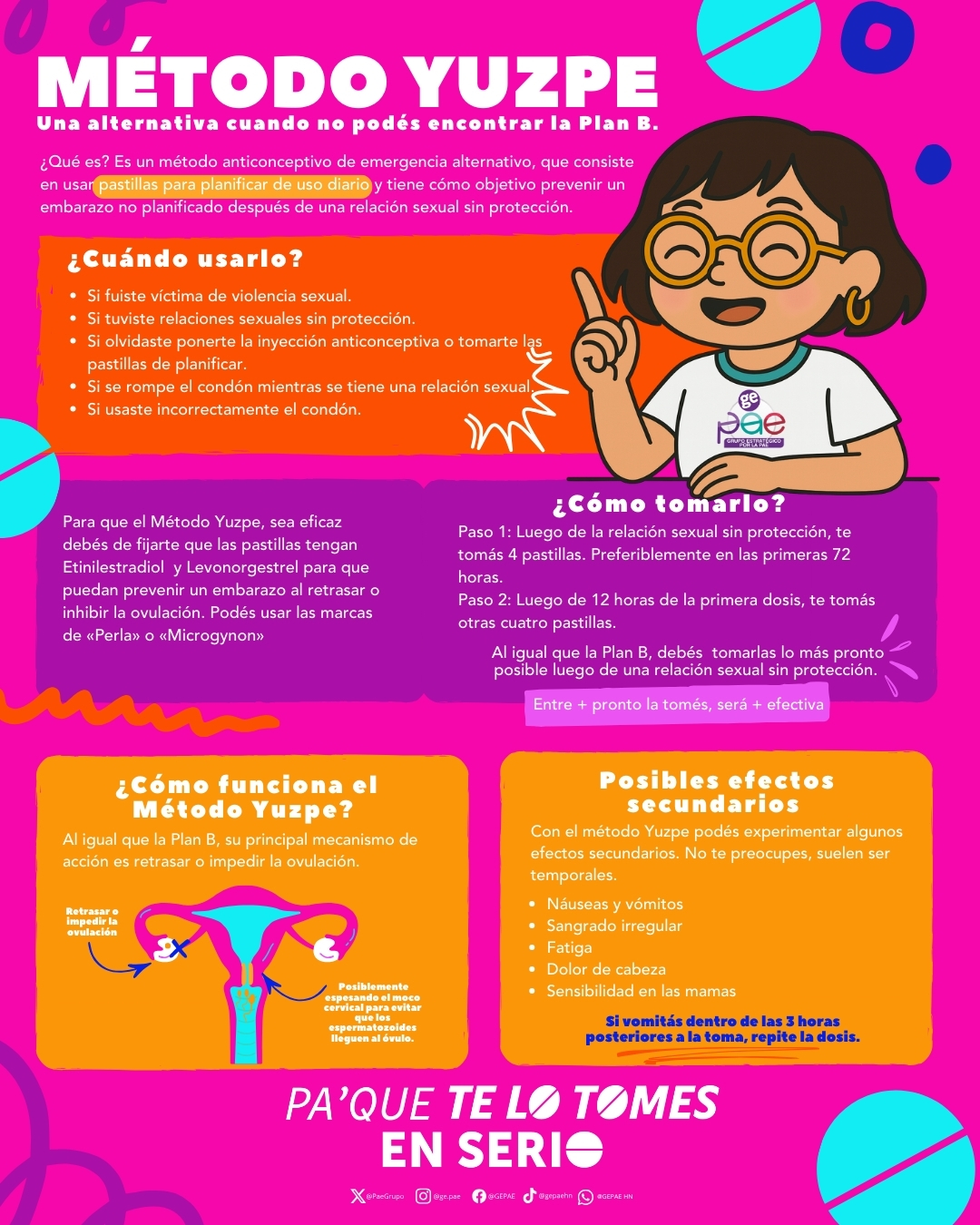Infografía sobre el Método Yuzpe: una opción de anticoncepción de emergencia que utiliza pastillas anticonceptivas de uso diario en dosis específicas para prevenir un embarazo no planificado cuando no se dispone de la PAE.